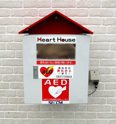 地域の皆様にも使っていただきたく、建物の外に「AED」を設置しております。何かありましたらご自由にお使いください。