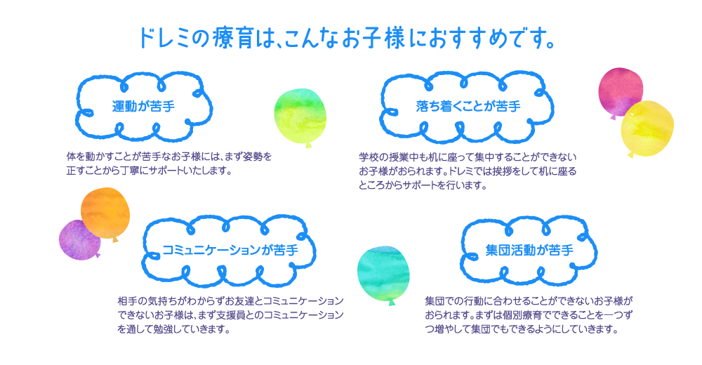 課題の克服や改善、集団生活への適応訓練を学習介入や行動介入を通して実施します。